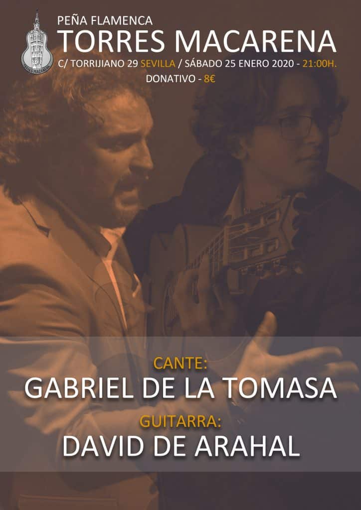 Recital de cante flamenco en la Peña Flamenca Torres Macarena a cargo de Gabriel de la Tomasa y David de Arahal. Será el día 25 de Enero 2020 a las 21:00 horas en la calle Torrijiano 29 de la Ciudad de Sevilla.