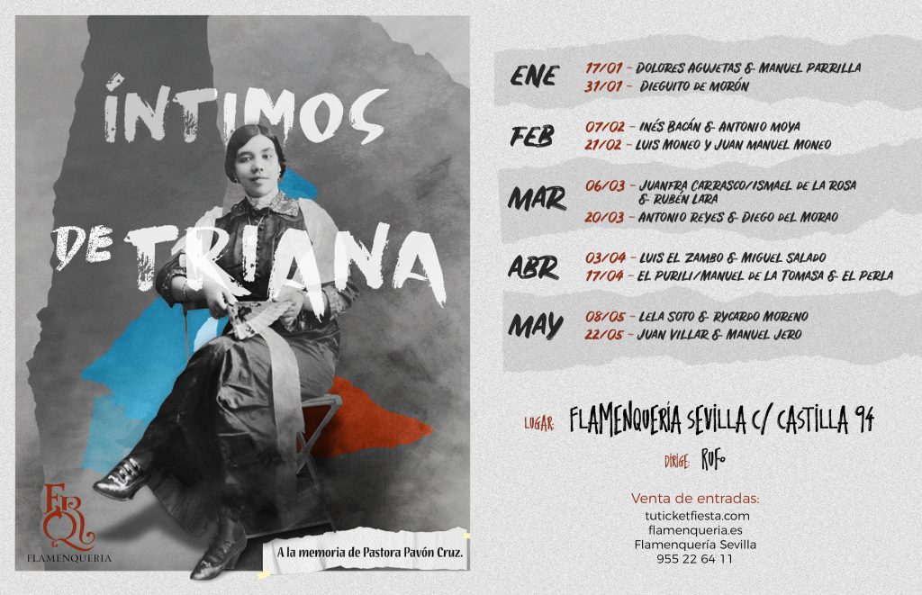Íntimos de Triana es un ciclo que pretende ampliar la oferta cultural flamenca de Sevilla, ofreciendo de esta manera una serie de recitales de máxima calidad en la más absoluta intimidad y en pleno corazón de Triana. El flamenco es un arte que puede y debe abarcar todos los formatos posibles, pero es sin duda en las distancias cortas donde se siente de una
