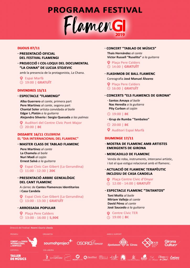 FlamenGI verá la luz del 7 al 17 de noviembre con el lema “Temps de flamenc amb talent d’aquí” (Tiempo de flamenco con talento de aquí). El festival nace desde la necesidad de llevar el flamenco de proximidad a los barrios más emblemáticos de la ciudad: Santa Eugència, Taialà, Pont Major y Onyar con una fuerte apuesta por el talento catalán.