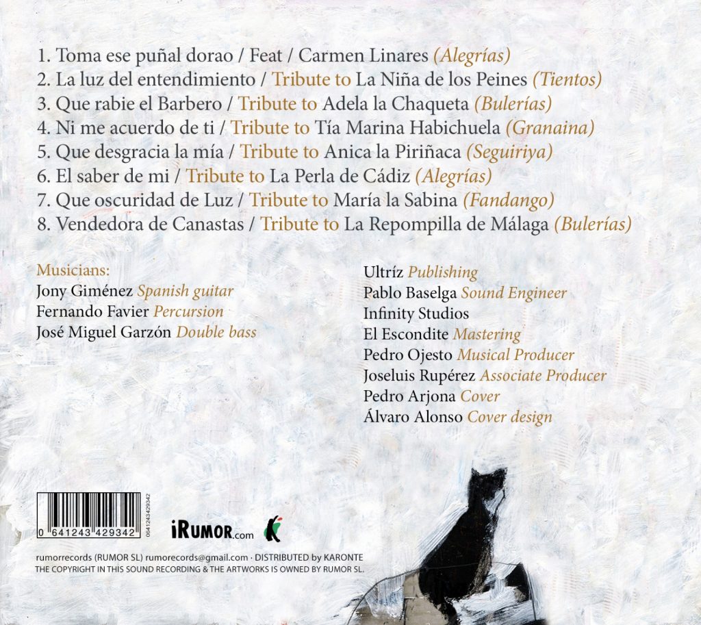 En este maravilloso trabajo podremos encontrar Alegrías junto a Carmen Linares, Tientos tributo a Niña de los Peines, Bulerías tributo a Adela la Chaqueta, Granaina tributo a Tia Marina Habichuela, Seguiriya tributo a Anica la Piriñaca, Alegrías tributo a La Perla de Cádiz, Fandangos tributo a María la Sabina, Bulerías tributo a La Repompa de Málaga.